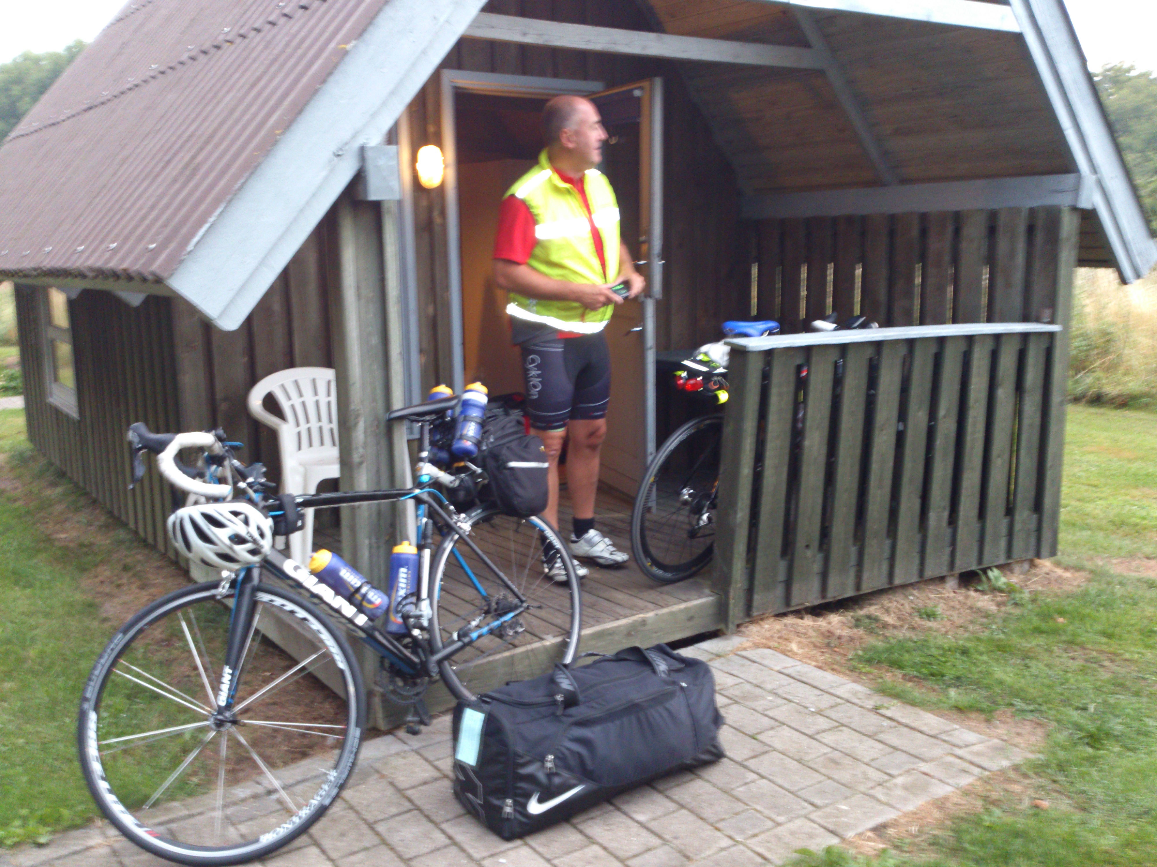 2013-08-16 Super Brevet Scandinavia 02 22. februar 2015 4000 × 3000 2013-08-16 – SBS 2013 – Vandrehjemmet i Sæby 02 Nå er Reidar og jeg begge klare. Da gjenstår det bare å låse av hytten vi har overnattet i, levere bagasjen til transporten, og så opp på sykkelen og igang med turens første dagsetappe på 330 km 🙂