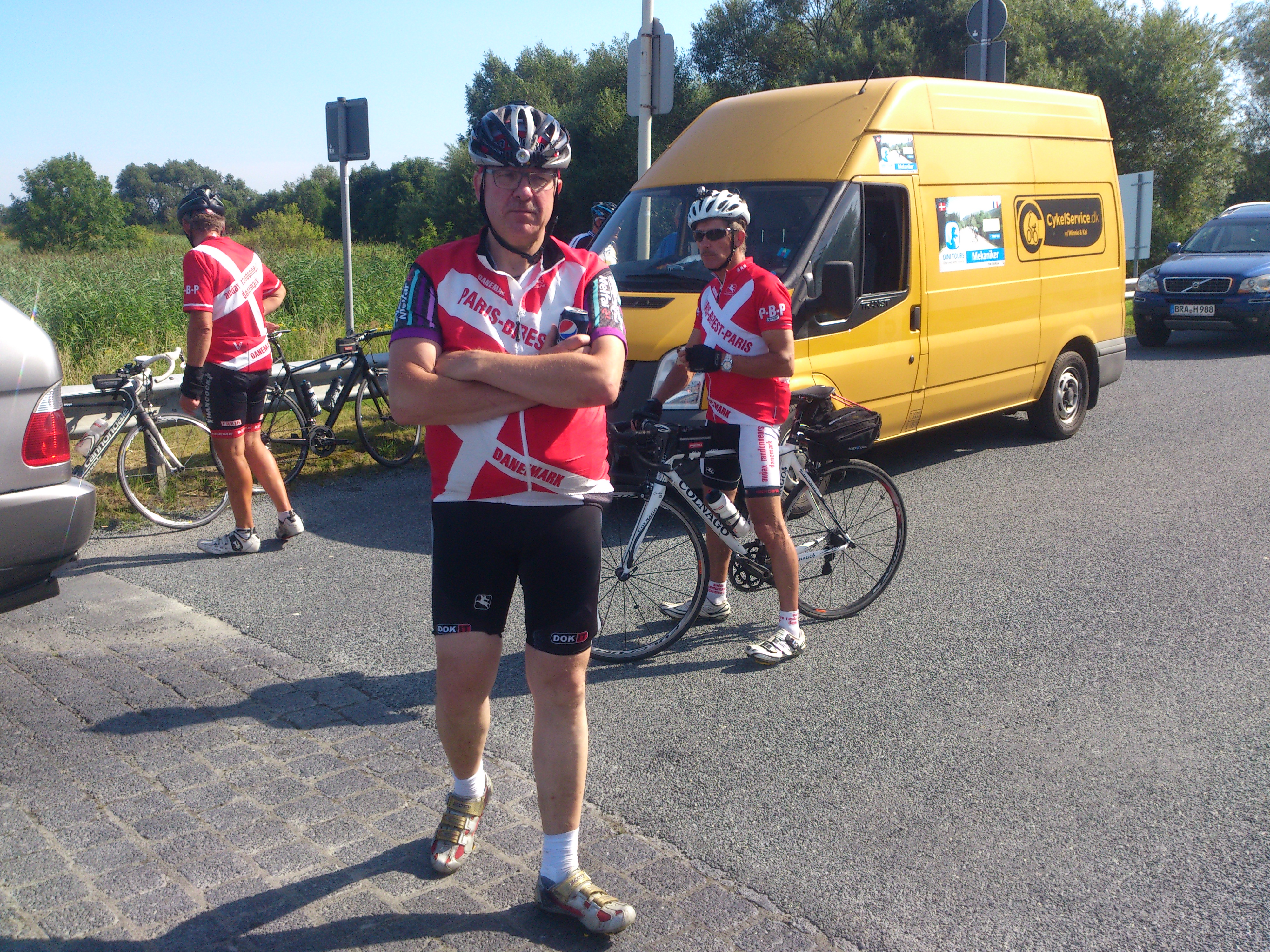 Haderslev-Paris – 1. etappe 16 2. mars 2015 4000 × 3000 2014-07-22 Haderslev-Paris, 1. etappe i Tyskland – Pust i bakken. Dini Tour servicebilen i bakgrunnen. Vibeke & Morten avtaler å treffe oss en time senere. Da vil de diske opp med formiddagskaffe etc. Herlig :).