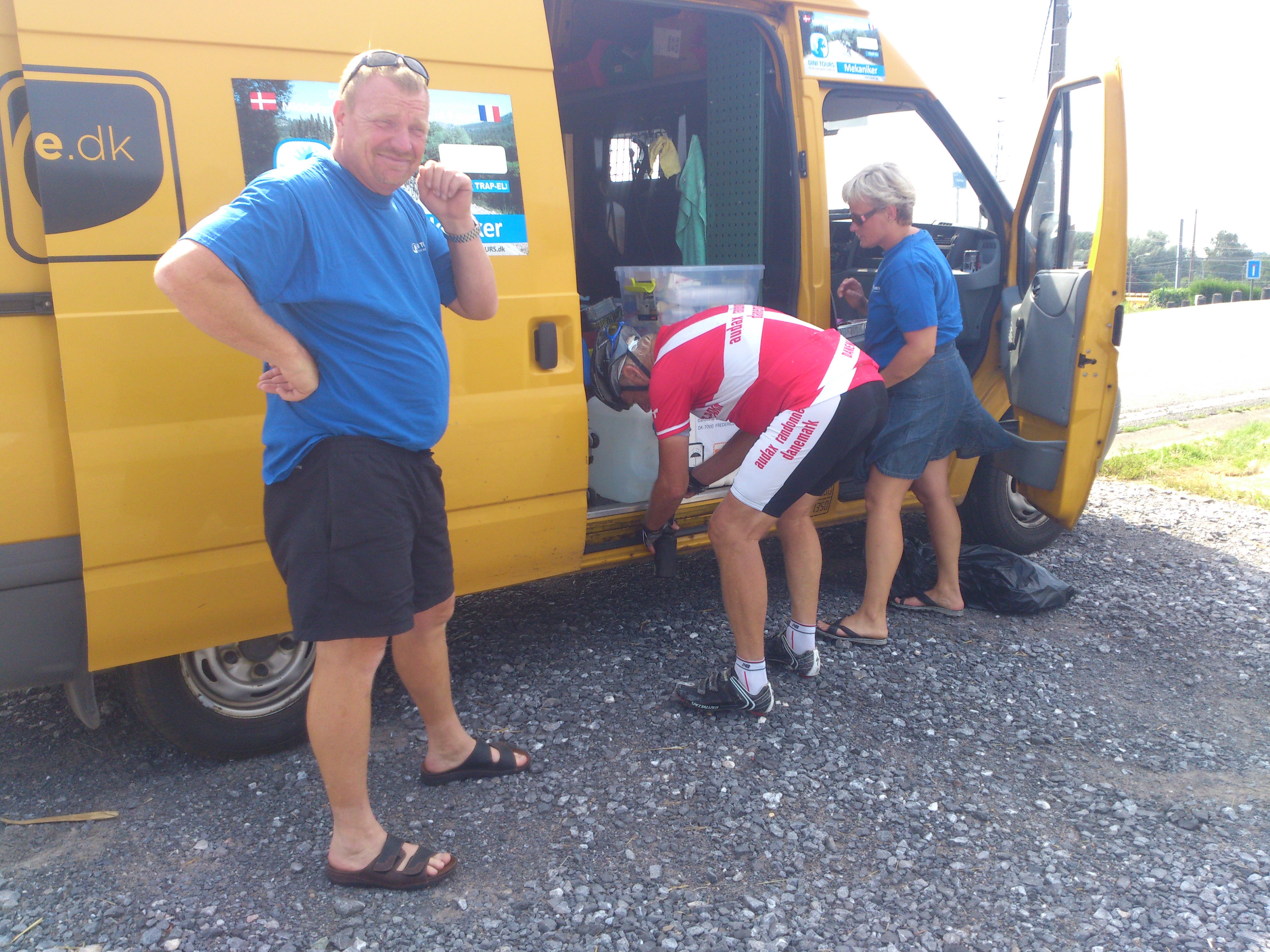 Vi har nå vært igang i halvannen time siden vi sist fikk bunkret drikke. Nå fikk vi plutselig hyggelig dansk selskap av Vibeke & Morten, som brakte rundt forsyninger til oss alle. Litt av en jobb, for alle 21 syklister var spredt over store avstander. Regner med vi lå sist i løypen igjen i dag :).