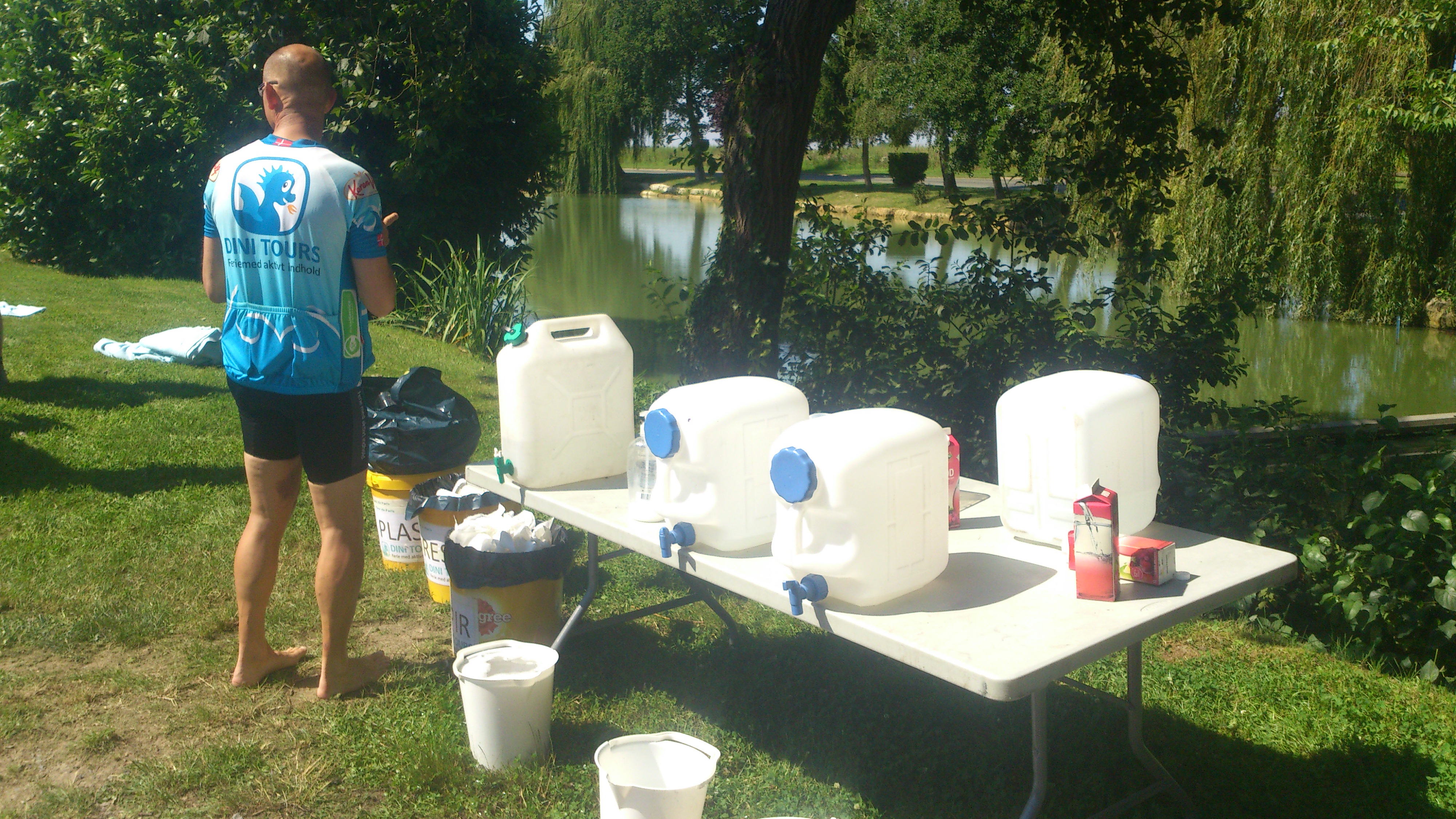 Haderslev-Paris – 4. etappe – 69 2. mars 2015 4000 × 2250 2014-07-25 Haderslev-Paris, 4. etappe i Frankrike – Lunsj i Chèvreville. En Dini Tours syklist får fylt opp vannflaskene sine. Det var ikke mangel på noen ting her :).