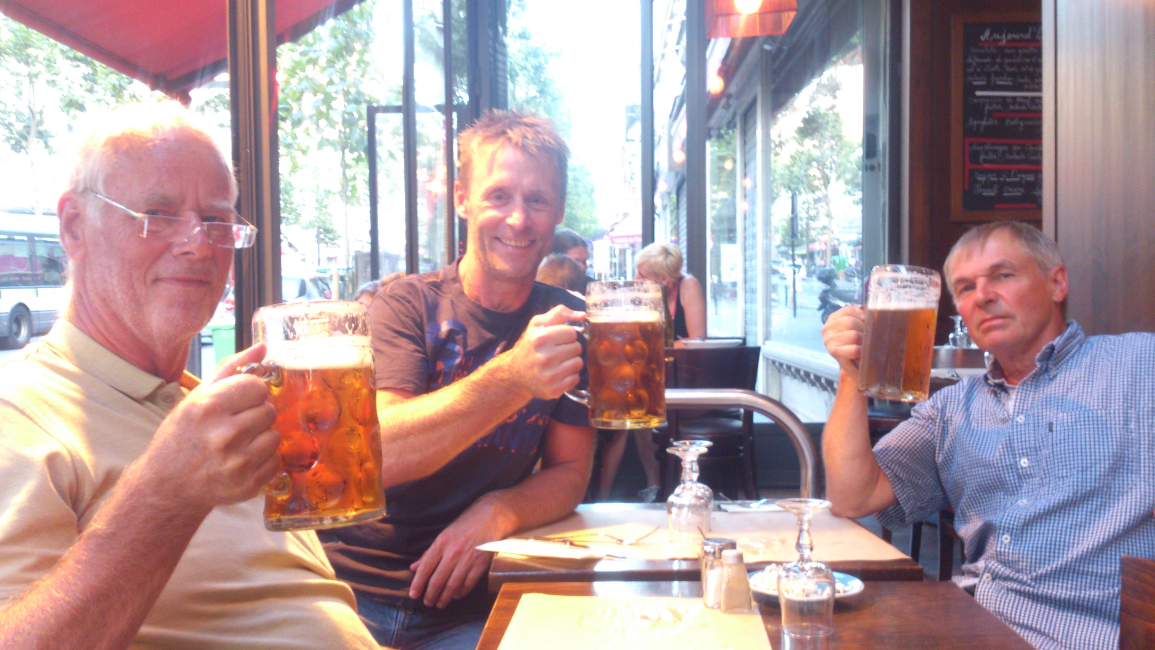 Ved bordet ved siden av oss satt et ektepar som så, at vi nok hadde likt å ha et bilde av oss alle tre samlet. Så de spurte om de skulle ta bilde av oss – og svaret var ja :). Skal sei at de kan være tunge å holde over tid, disse glassene med godsaker. Vi drakk belgisk Leffe Blonde – og det smakte helt fantastisk :).