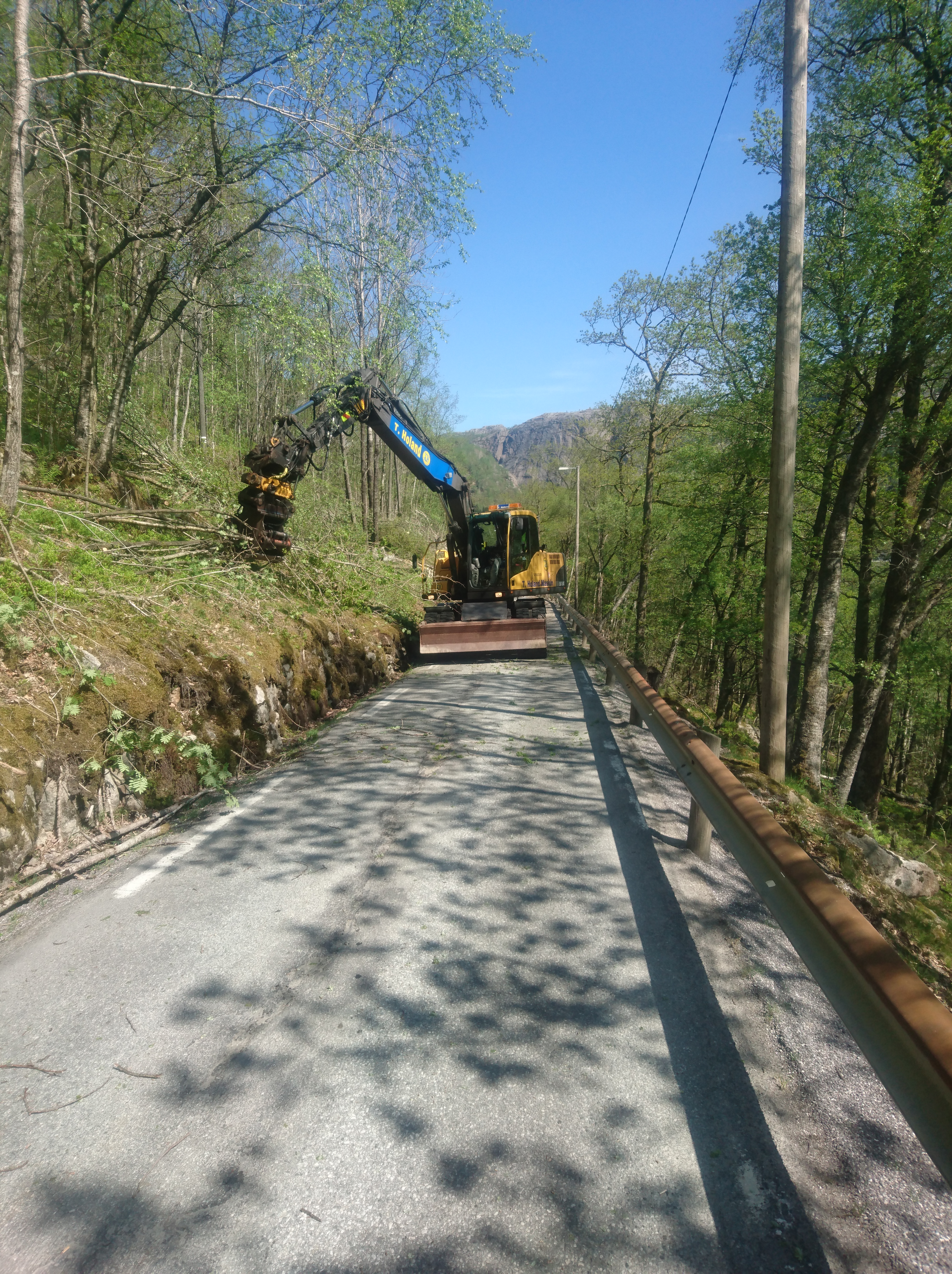 På nedsyklingen til Eide og E39 måtte vi igjen stoppe opp for veiarbeid. Denne gangen var rydding i krattet. Etter få minutters venting var de så snille å flytte på maskineriet så vi kunne fortsette vår ferd.