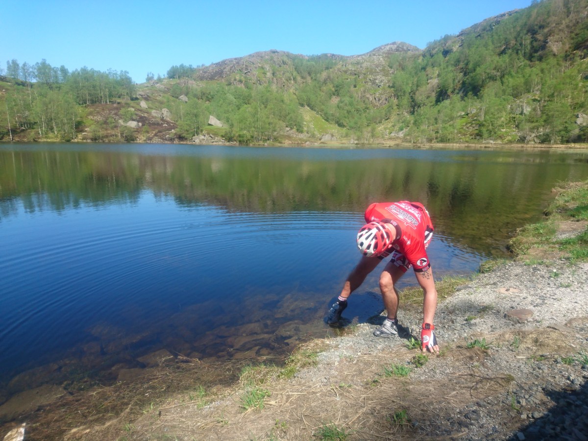 På toppen av bakken var det veiarbeid. Ny asfalt skulle legges. Vi måtte derfor trekke syklene i grøften flere hundrede meter. Underveis greide Roar og miste fotfeste og kjørte foten sin ned i et sorpehull. Derfor måtte skoen vaskes før turen fortsatte videre.