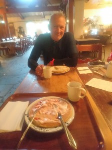Gulvet under oss, der vi satt å fikk kaffen vår, var en stor dam. Føltes som om folk så litt rart på oss, både fordi vi hadde sølt så mye rundt oss, men sikkert også fordi de lurte fælt på hva det var for et par raringer som bega seg ut på sykkel i så stygt et vær.