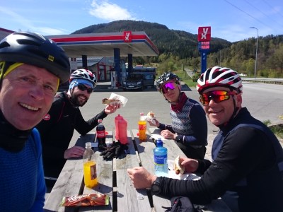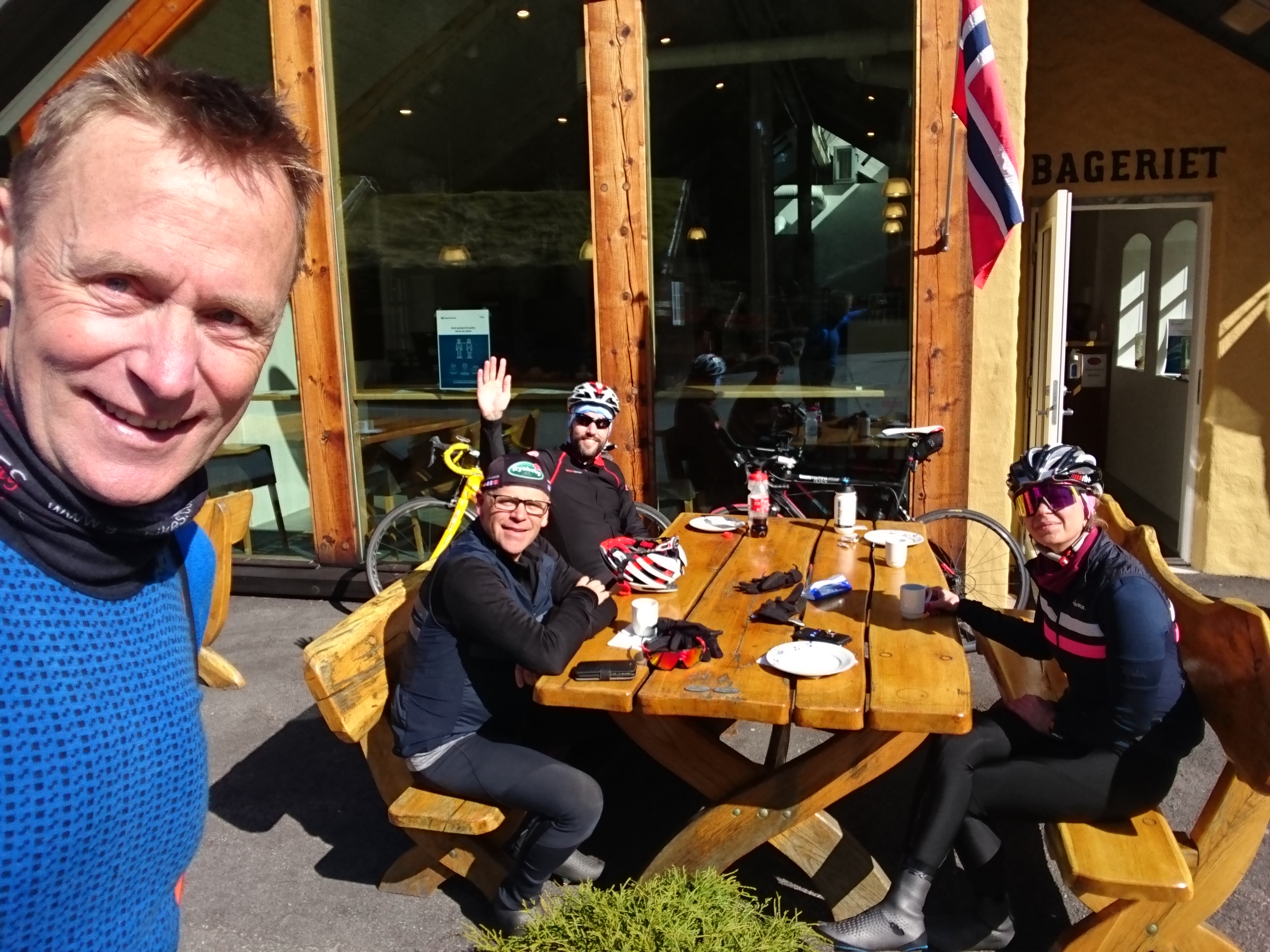 Vi satte fort igang og satte kursen mot Byrkjedalstunet. Vi hadde utsatt start fra Sverd i fjell en halv time for å sikre at Byrkjedalstunet hadde åpent når vi kom dit. Best å få bunkret litt før vi fortsatte mot Tonstad, da GP-en på Sinnes jo hadde stengt pga. ombygging. Hastighet over Seldalsbakken og videre gjennom Oltedal og Dirdal var tydeligvis helt perfekt, for akkurat da Jens klikket seg ut av sykkelpedalene, hørte vi nøkkelen i døren bli vridd rundt og brødutsalget åpnet.
