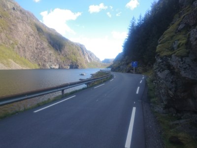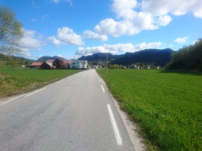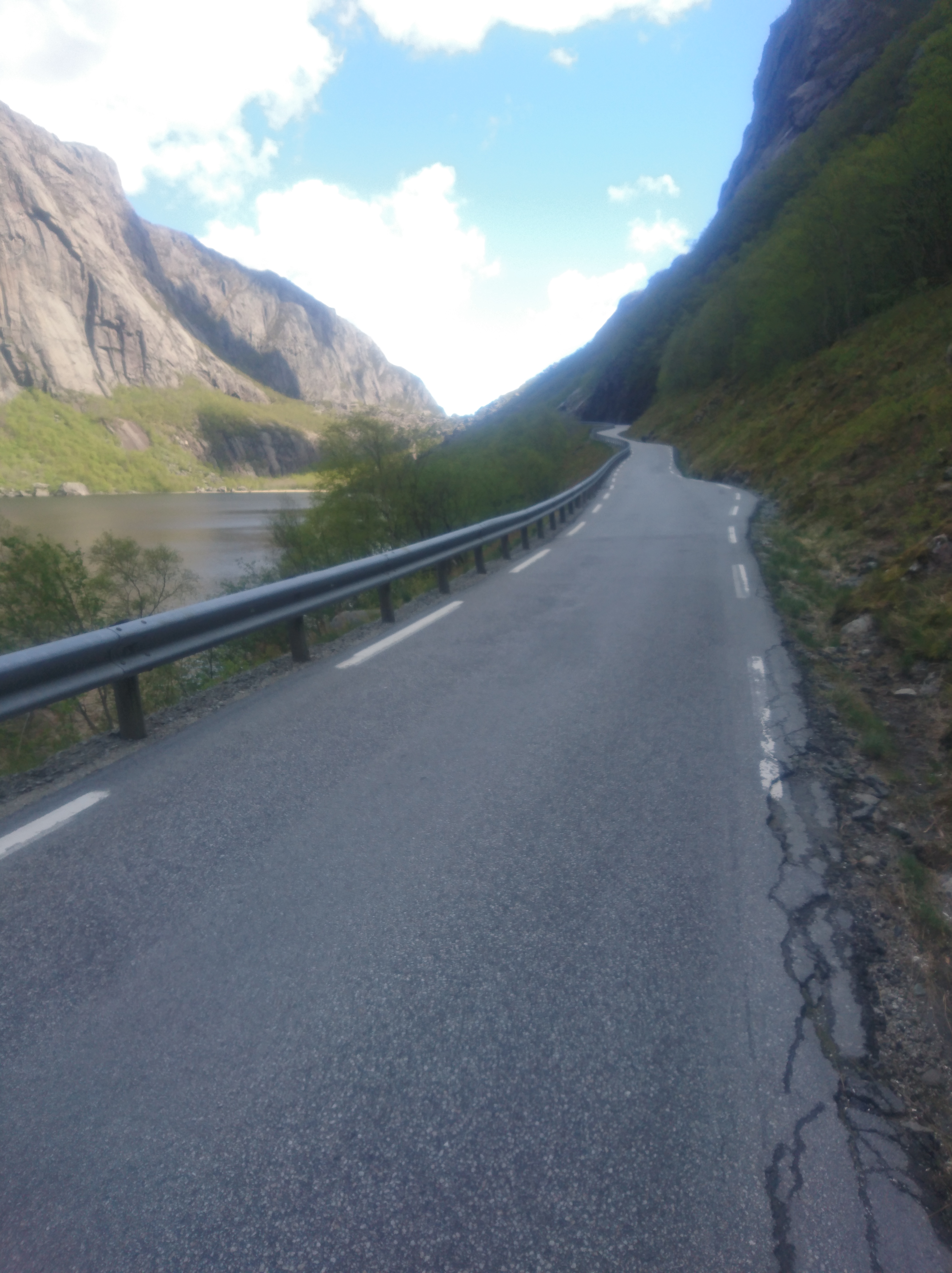 Etter å ha vært på Eige, er det nedstigning til Vikesdal. Derfra er det ca. 10 km til Bjerkreim, med en slak stigning. En kilometer fra Bjerkreim kunne jeg i det fjerne se fjellene som jeg snart skulle sykle i. Et mektig skue.