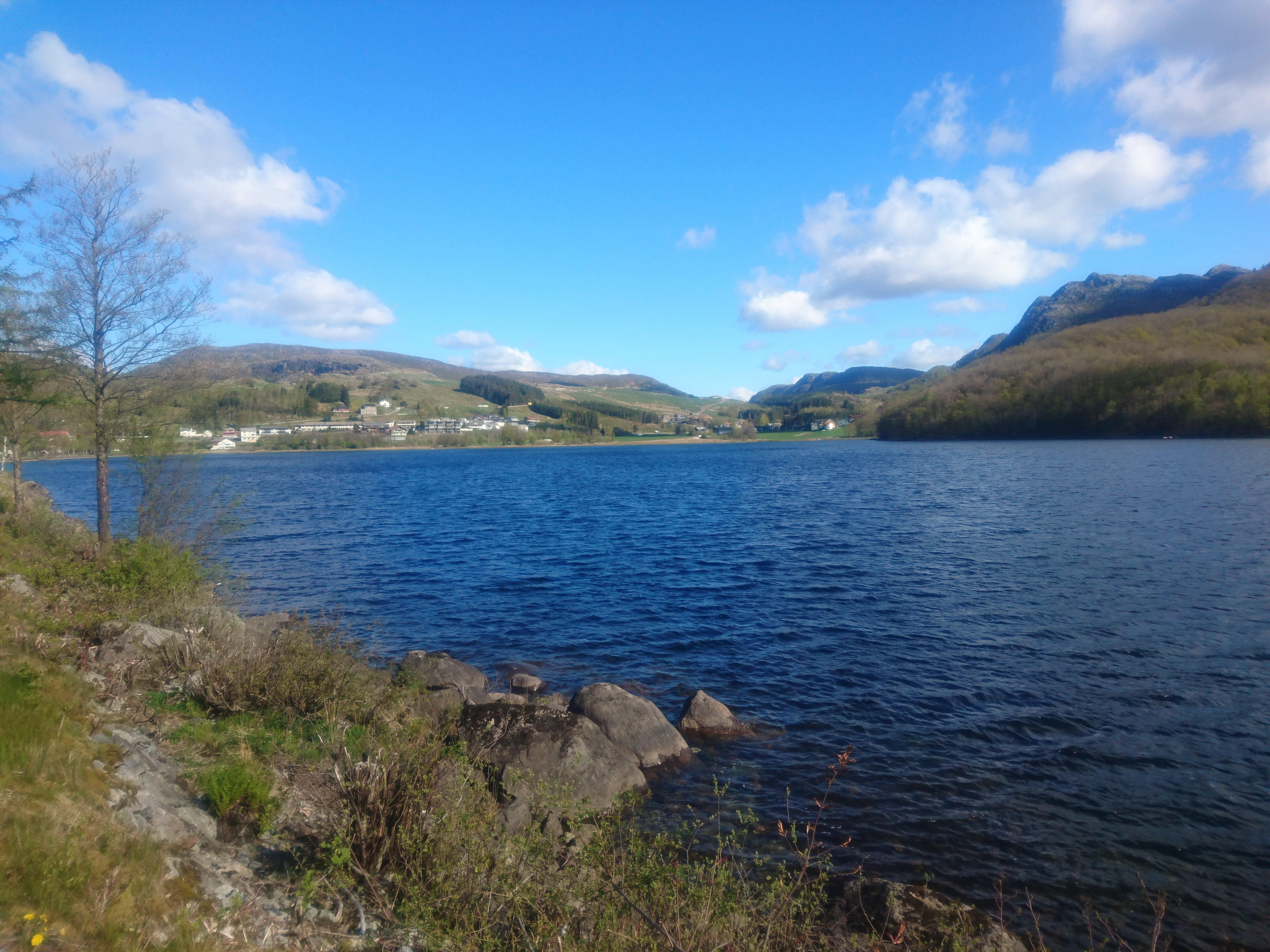 Bildet tatt på Espeland. Vannet heter Ytra Vinjavatnet og i bakgrunnen ses tettstedet Veen. (Klikk på bildet for forstørrelse).