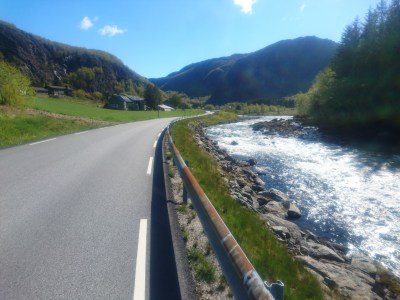 På Vikeså måtte jeg ha meg en ikke planlagt pause. På Ogna hadde jeg spist reker, og det hadde åpenbart lagd problemer for magen min. Derfor brukte jeg litt lang tid her. Jeg benyttet anledningen til å ringe til May-Brit, samboeren min, og hørte om hun hadde lyst til å sykle til Byrkjedalstunet fra Ålgård, og så treffe meg der. Da kunne vi sykle hjem ilag. En vinn, vinn situasjon :). May-Brit var med på forslaget, og vi satte derfor kursen mot Byrkjedalstunet fra hver vår kant. Veldig kjekt.