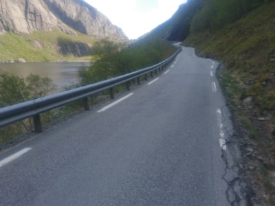 May-Brit og jeg hadde tenkt oss å få oss kaffe og litt å bite i på Byrkjedalstunet. Dessverre var det pga. koronatidene kun åpent i helgene, så kaffekosen måtte vi bare tenke oss til. Vi satte kursen hjemover. Mye vind, ganske kald også, rett imot oss. Vi satte en god og jevn hastighet og innen lenge var vi i Dirdal. Fra Dirdal skulle vi opp til Røyrdalen, og for å komme dit måtte vi sykle på utsiden av Røyrdalstunnelen. Det er en bakke på ca. 1,7 km og med en stigning på knapp 8%.