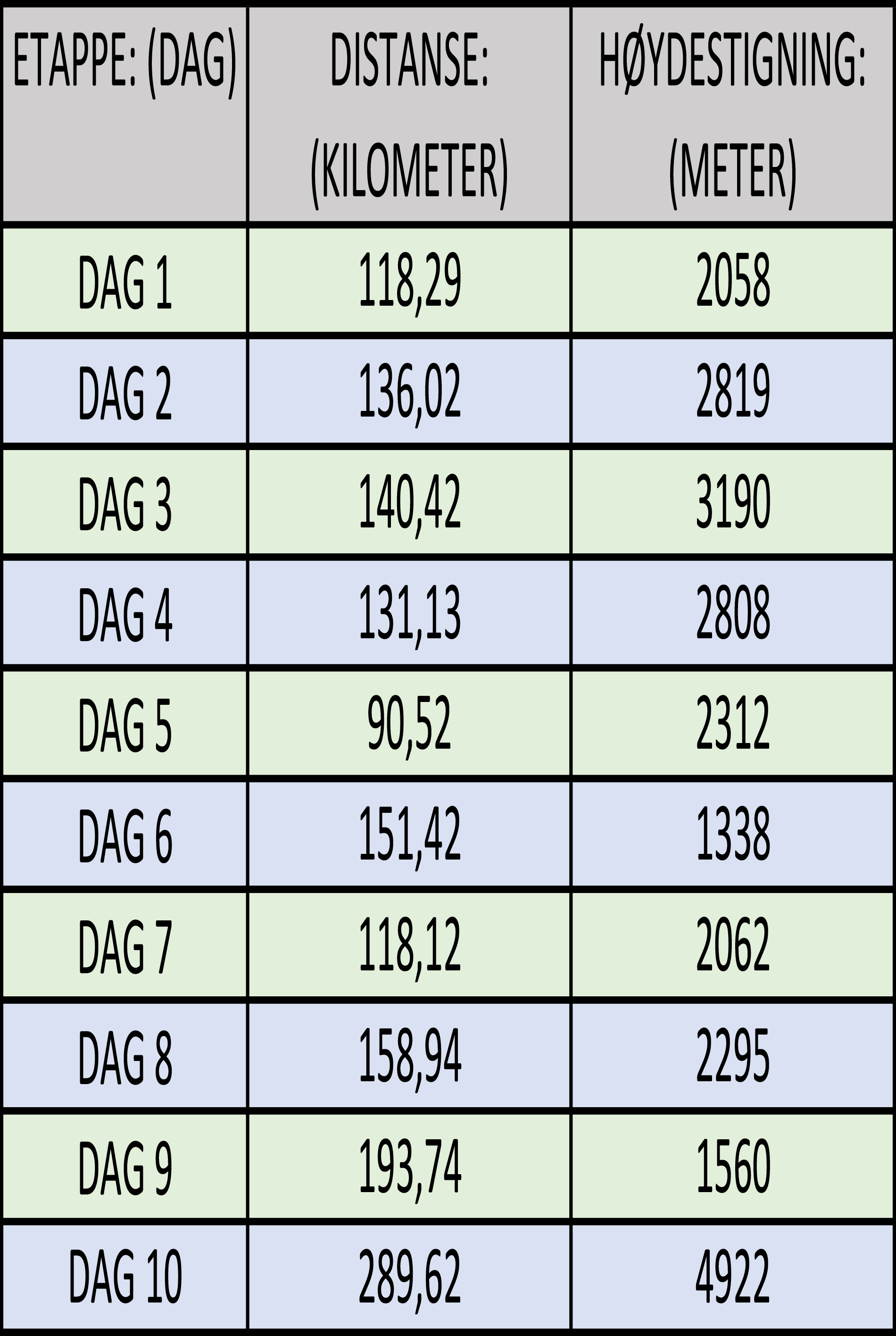 For å ha størst mulighet for å gjennomføre rittet, bestemte jeg meg for å kjøre safe og fordele hele turen på like lange dagsetapper over alle 12 dager, dvs. 127,3 km hver dag. Etterhvert som dagene gikk, og jeg kjente at jeg høyst sannsynlig kom til å komme meg helt til mål, valgte jeg å utfordre meg ytterligere ved å gradvis å øke den daglige distansen og korte litt ned på antall dager. Oversikt over dagsetappene ses på bildet under.