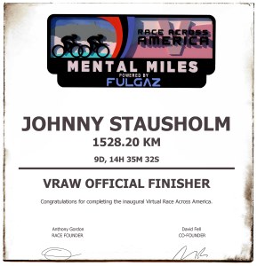 Fredag 26/6 2020 klokken 05:52 hadde jeg gjennomført første utgaven av Virtual Race Across The West (VRAW). 1528 km og 25362 høydemeter var tilbakelagt på sykkelrullen hjemme på loftet på Ålgård. Totalt brukte jeg 9 dager, 14 timer, 35 minutter og 32 sekunder, hvorav 2 dager, 22 timer, 28 minutter og 42 sekunder var tilbrakt på sykkelrullen.
