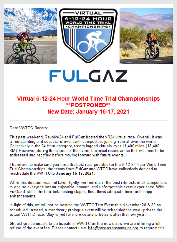 Som melding i mailen beskriver, er det plattformen FulGaz som anvendes under VWTTC. Det er samme plattformen som ble anvendt under Virtual Revolve24 (VR24) i helgen, 21. – 22. november, og under avviklingen av VR24 avdekket man småfeil og -mangler i FulGaz. Disse feilene ønsker man å få rettet opp på, slik at kommende VM kan arrangeres uten forstyrrelser.