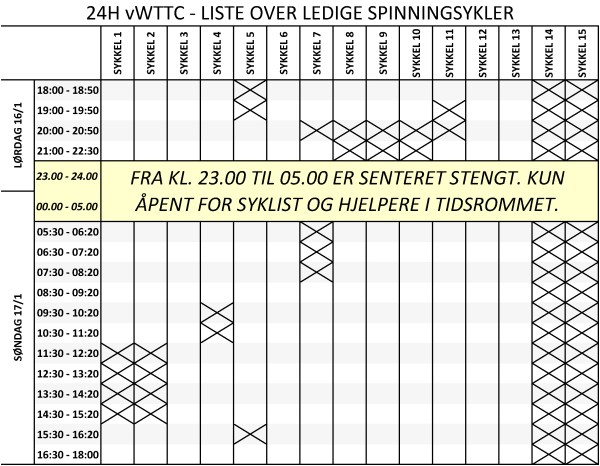 Oversikt over ledige og opptatte sykler under 24H vWTTC. Oppdatert 15/1 kl. 23:30, (Felter merket med X er reserverte sykler)