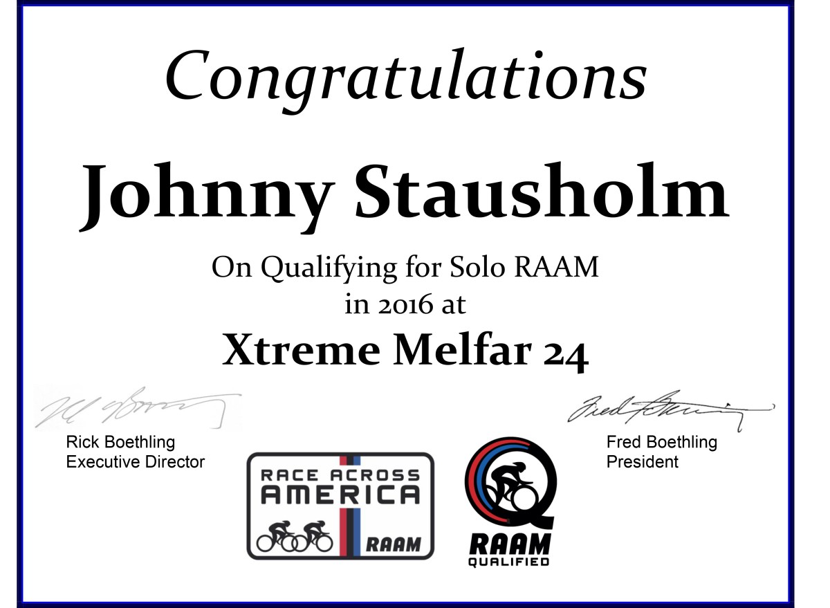 2016 Xtreme Melfar 24 – 54 16. juli 2016 3225 × 2363 Bekreftelse og godkjenning fra RAAM Ledelsen i RAAM har sendt ut bekreftelse på fullført og godkjent kvalifisering til deltakelsen i RAAM. Kvalifiseringen er gyldig til og med 2018. Satser på deltakelse i 2017 – dersom det blir mulig å få tilstrekkelig med sponsorer til prosjektet.