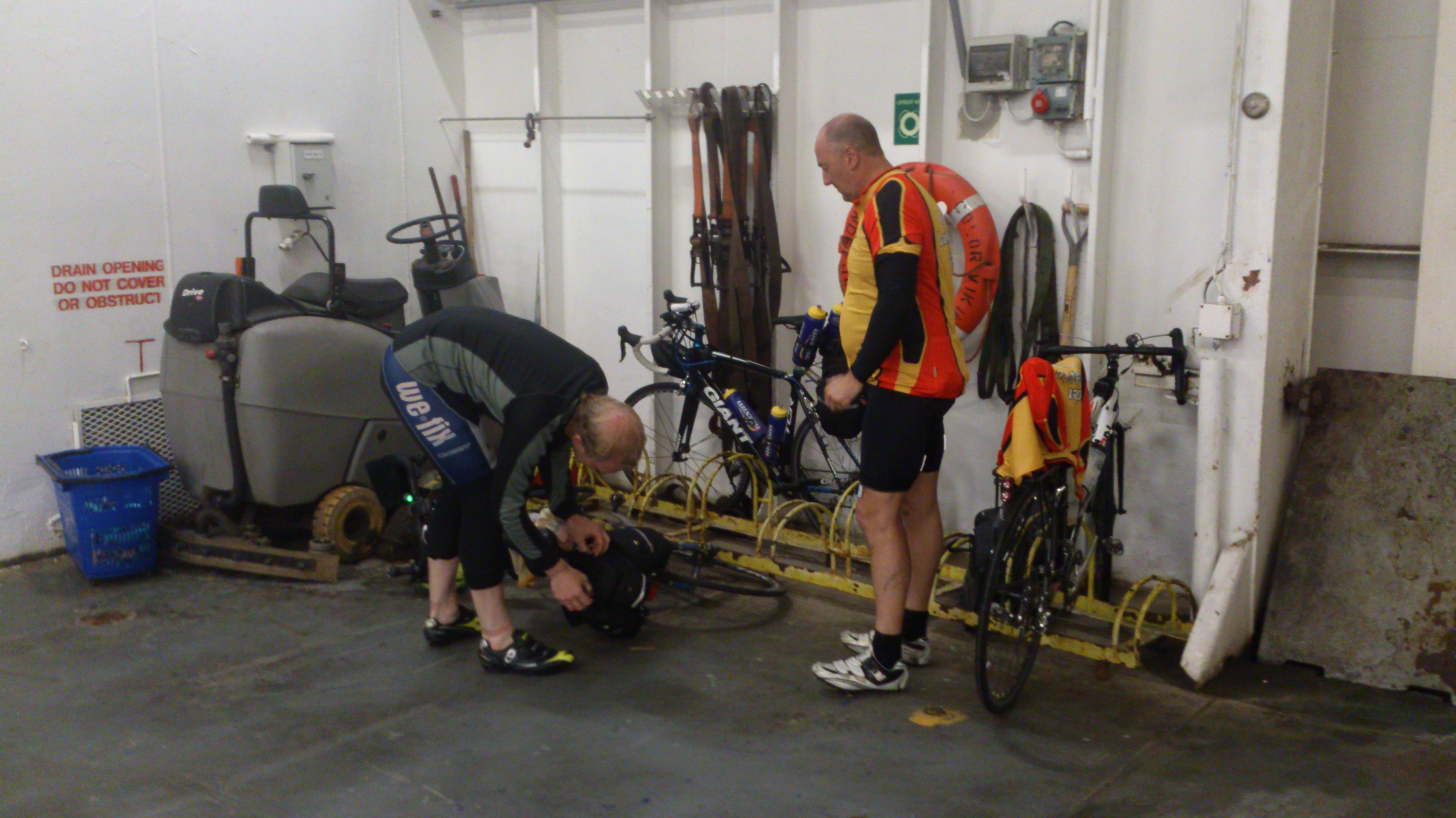 Ombord på ferjen fra Sandefjord til Strömstad. Syklene parkeres på bildekket og på med litt tørre og rene klær. Må jo være litt «fine» når vi entrer restauranten 🙂