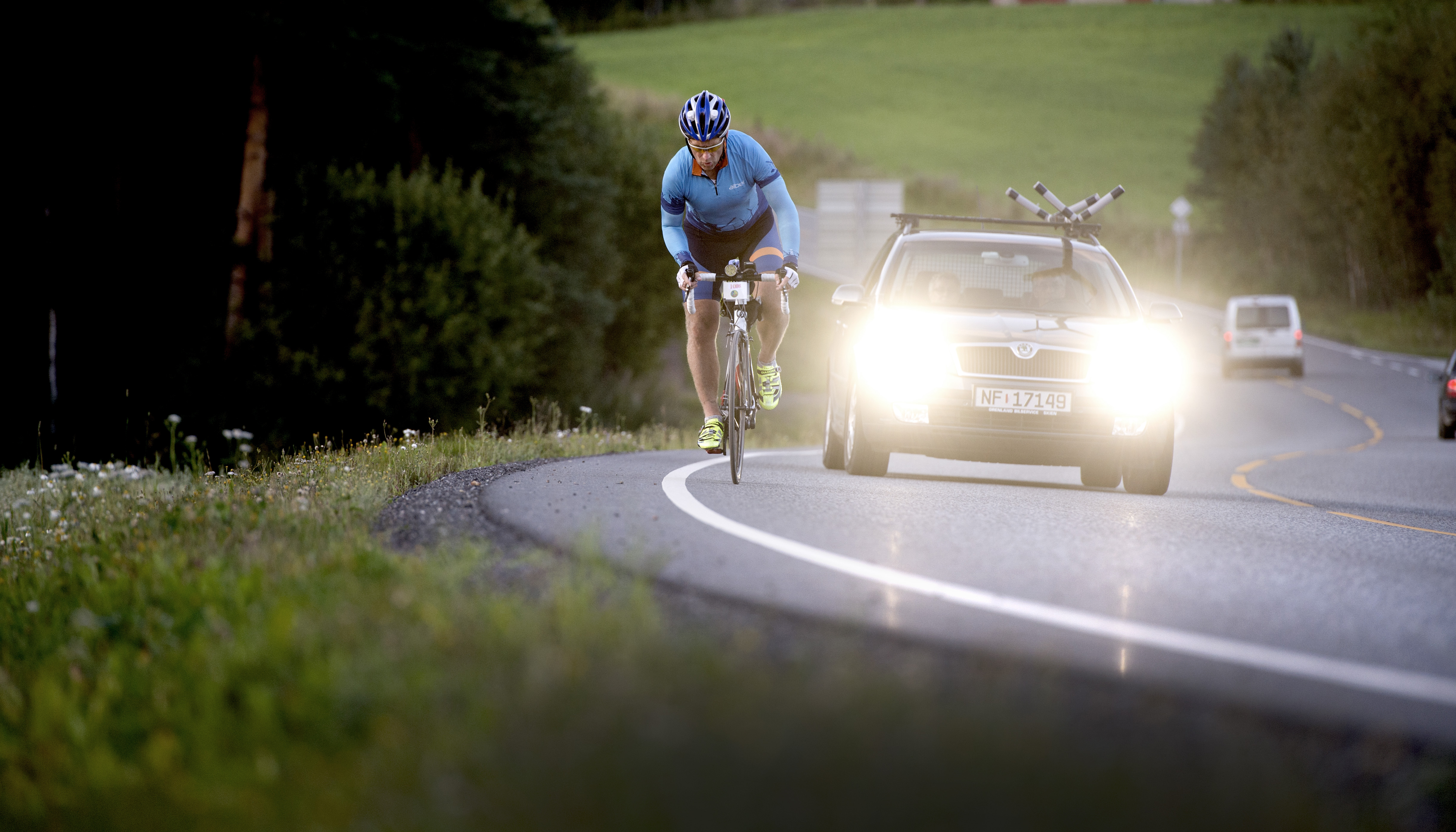 Ca. 14 km før Skien tok journalist Ludvig Lorentzen og fotograf Anders Minge fra Stavanger Aftenblad imot oss. Peter og jeg stoppet opp og hilste på og fikk oss en kort prat. Ludvig og Anders skulle følge oss videre på turen helt til mål i Kristiansand dagen etter. Veldig kjekt 🙂