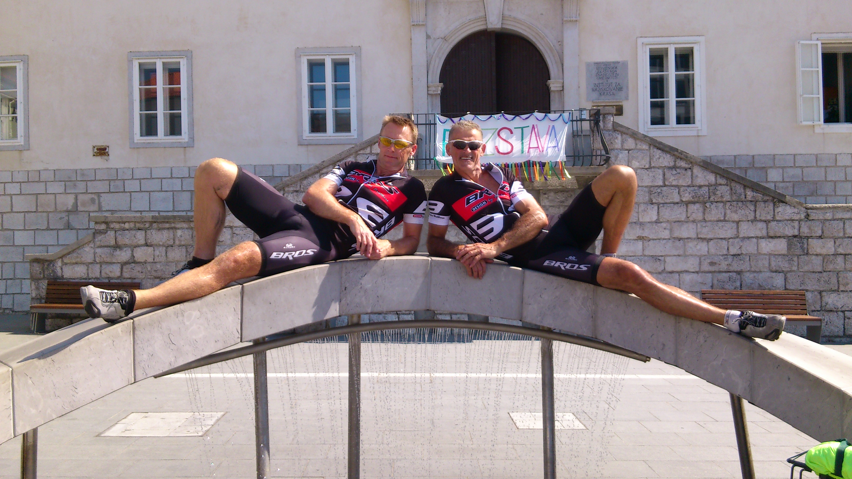 I går, da vi syklet fra høytliggende Podkoren i den nordlige delen av Slovenia til lavtliggende Postojna i sør, så vi at fjellene gradvis avtok og varmere luft langsomt kom oss i møte i takt med at vi syklet sør-over. Dette tegnet godt. Overnattingen i Prostoina var min første natt hvor det var nødvendig å anvende kjøling på rommet om natten. Det viste seg i etterkant at det nærmest var et must på resten av turen, men dessverre ikke alltid var tilgjengelig – og da var natten alltid lang og forferdelig varm 🙂 Her lar de to lekre sykkelguttene seg avfotografere opp på byens sentrale springvann (vann strømmer under skulpturen vi ligger på) før turen starter mot Kroatia. I da skal grensen mellom Slovenia og Kroatia krysses, og byen Senj, ca. 140 km unna, er dagens mål.