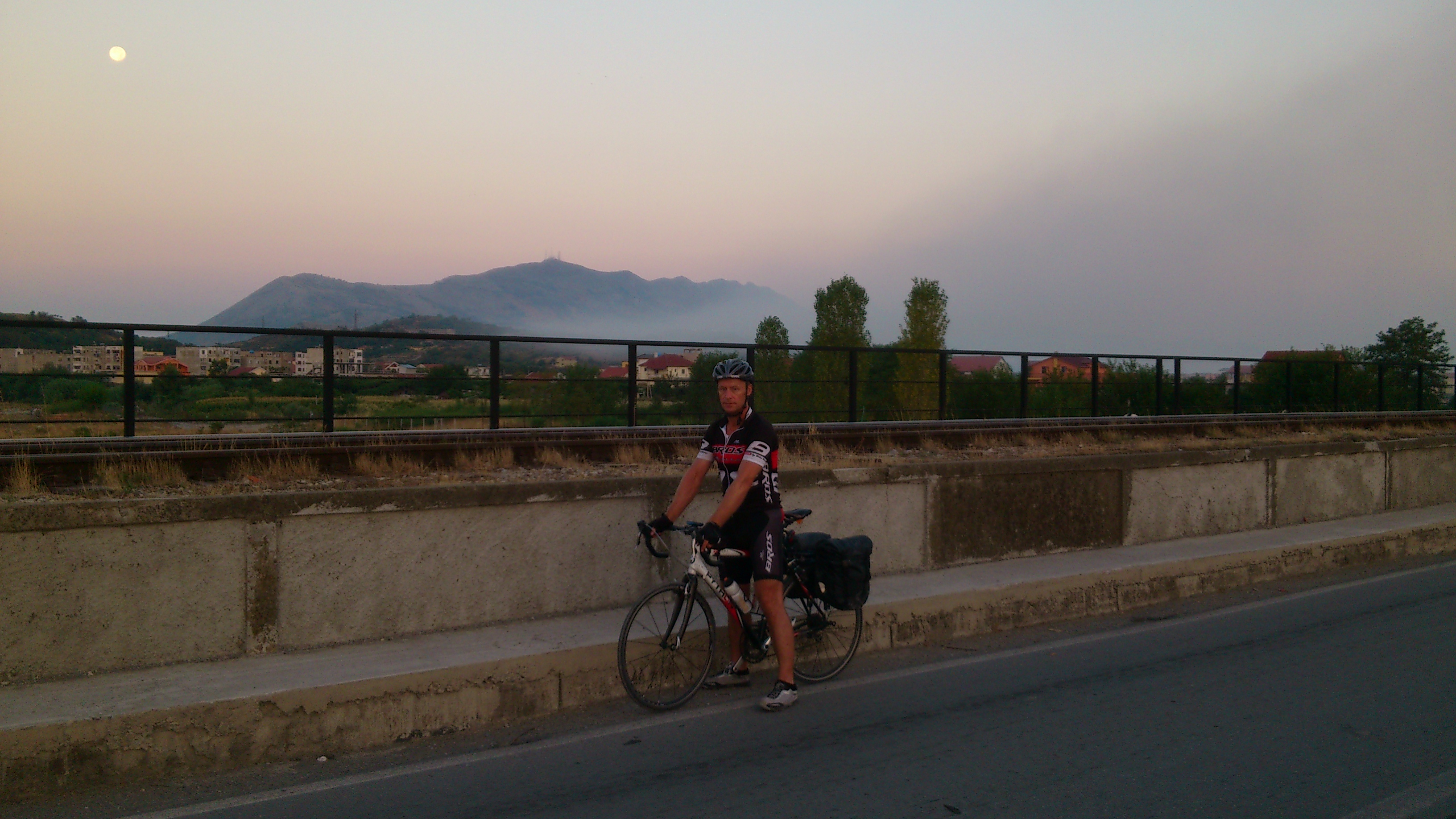 Norge-Kosovo 2012 10. februar 2015 3264 × 1836 2012-08-03 – Dag 24 – Albania. Dagsrute: Shkodër-Peja. Måtte stoppe opp her også og ta bilde. Her ser man fargene på himmelen som viser at solen er på vei opp. Månen som fortsatt ses øverst til venstre på bildet, og tåken som henger inn over landskapet mot høyre.