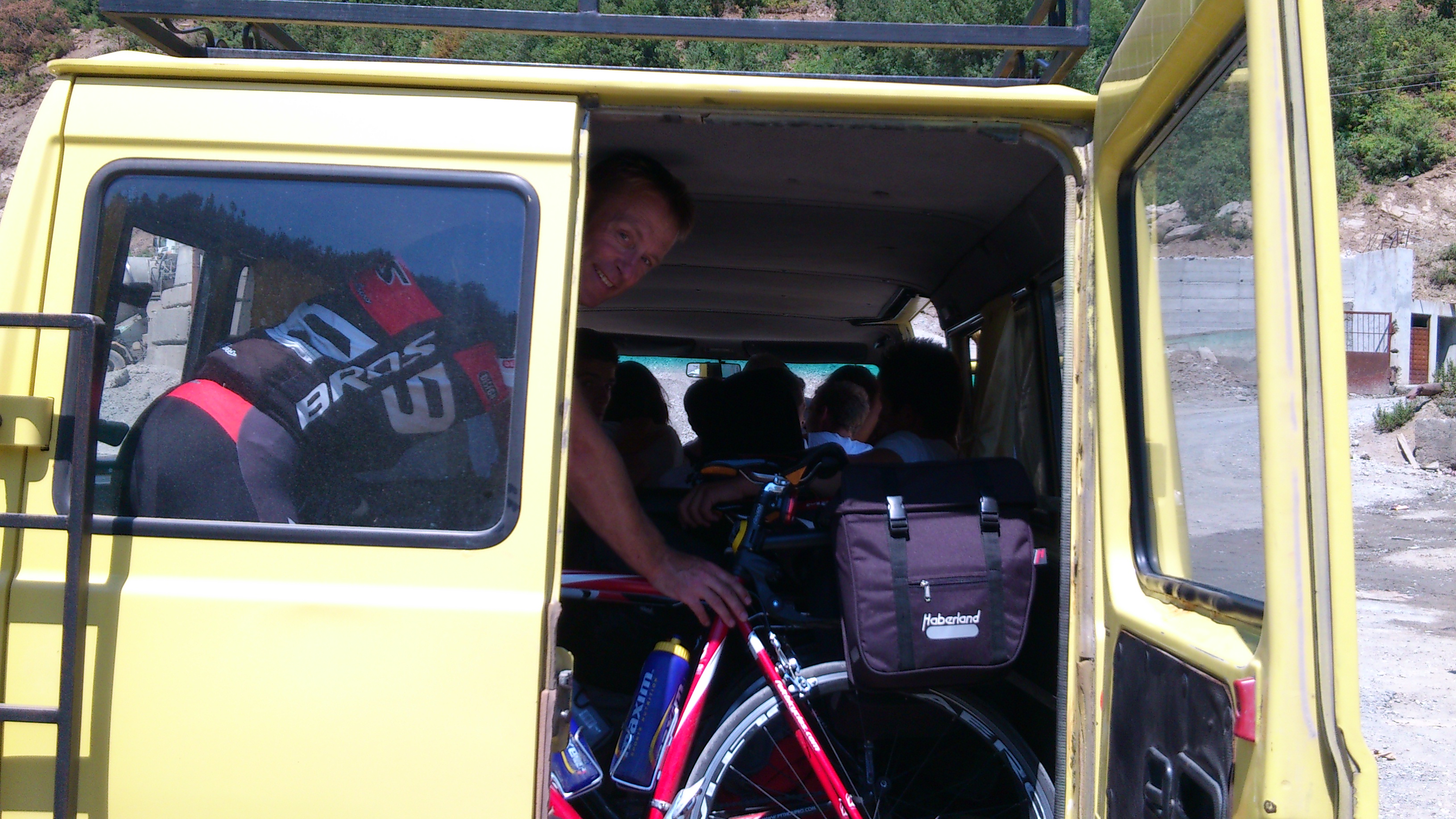 Ibrahim og jeg skulle stå bakerst med syklene vår, og sammen med bagasjen til de andre i bilen. I tillegg til oss to, var det ikke mindre enn 18 stk. inkl. sjåføren. Forstår slett ikke at støtdemperne kunne klare det, for det ble i tillegg kjørt hardt 🙂