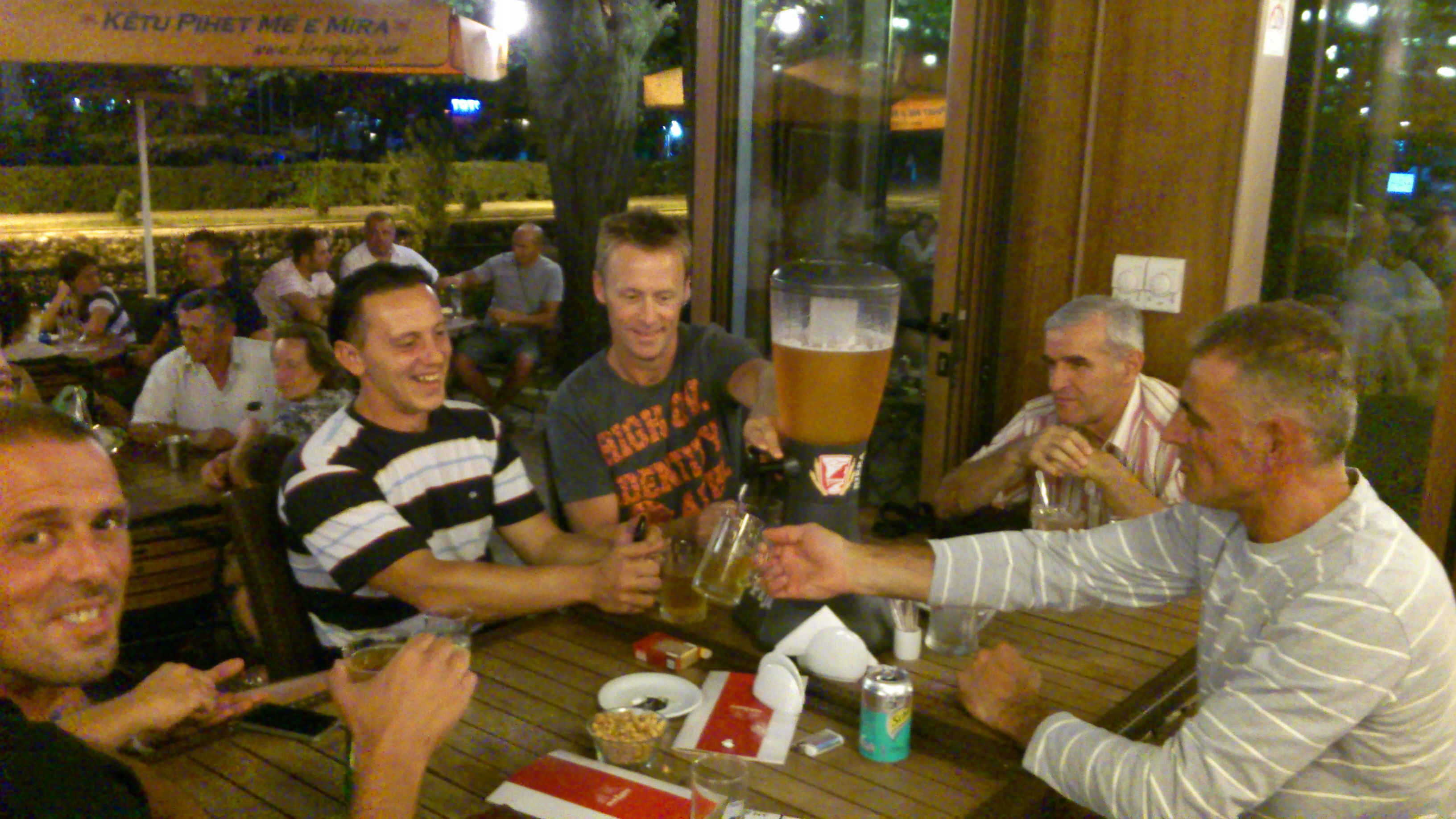 Siste kveld før hjemreise til Norge ville Ibrahim sitt søskenbarn, Defrim Decani, han som sitter på min høyre side og skjenker øl, spandere øl på oss. Jeg gjorde store øyne da jeg så pokalen som ble satt på bordet. Den rommet 5-6 liter øl og holdt ølen kald for oss. Han fortalte meg ut på kvelden at han hadde hørt med betjeningen om han kunne få kjøpe pokalen, for så skulle jeg fått den og hatt den med meg hjem til Norge som et minne hehe. Veldig festlig og hyggelig type 🙂
